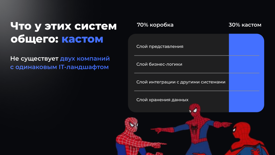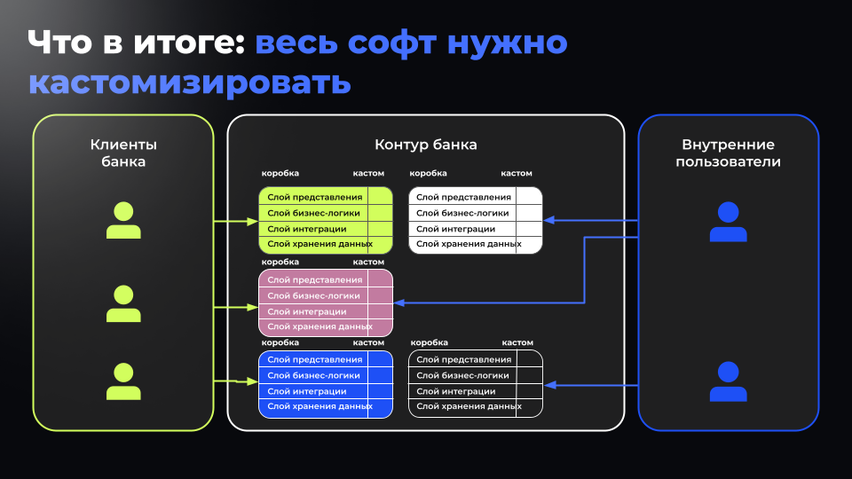 При внедрении системы в контур банка доработки требуются сразу во всех четырёх слоях, потому что не существует двух одинаковых компаний с одинаковым IT-ландшафтом.