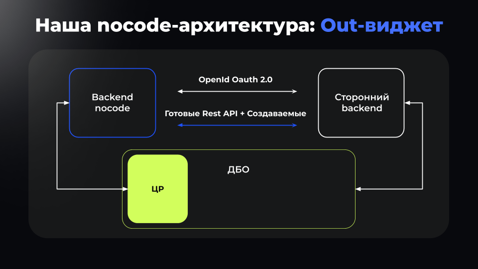 Out-виджеты — когда требуется встроить собранное в платформе решение в другую систему, например, добавить функциональность цифрового рубля в существующее ДБО.