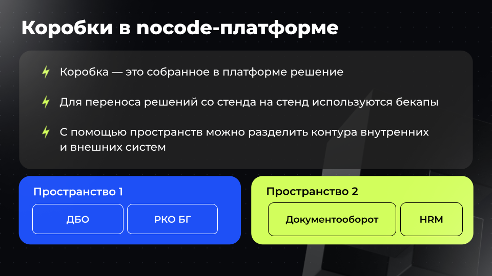 Если nocode-подход используется для создания внешних и внутренних систем одновременно, можно применять инструмент пространств — для изоляции пользовательских баз.