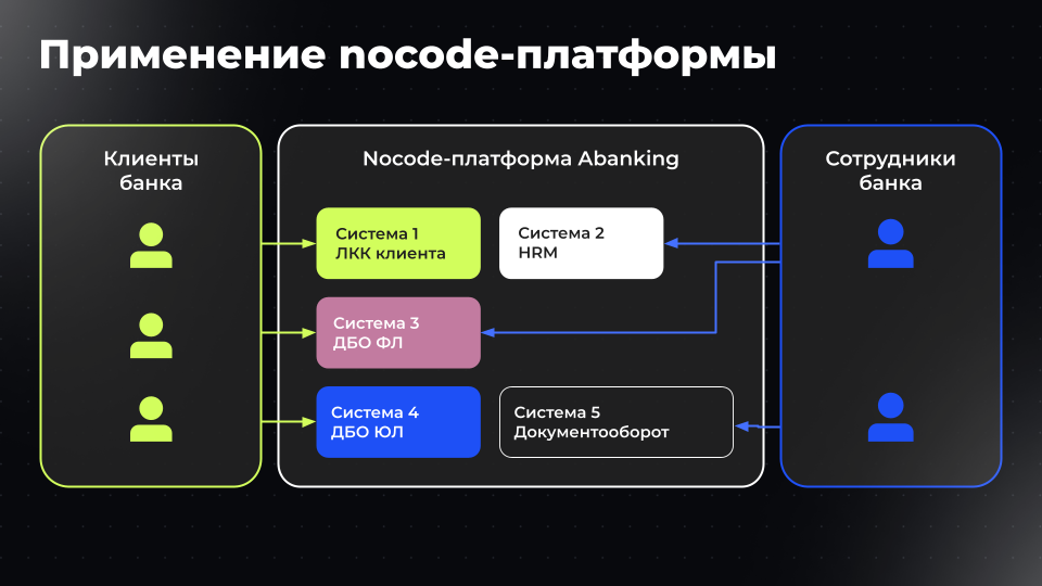 Все решения — результат работы внутри графической среды. Количество систем может быть любым и зависит только от задач заказчика, а производительность и масштабирование берёт на себя Abanking.